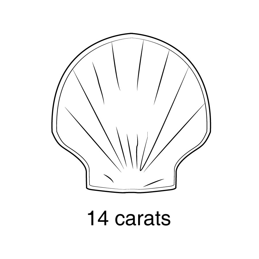 - Or 14 carats (585 millièmes) : coquille Saint-Jacques, visible sur des bijoux récents ou anciens.