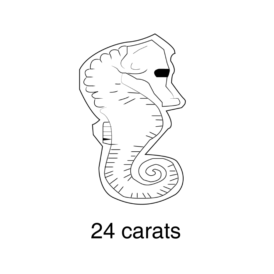- Or 24 carats (999 millièmes) : hippocampe, principalement réservé aux lingots et créations neuves.