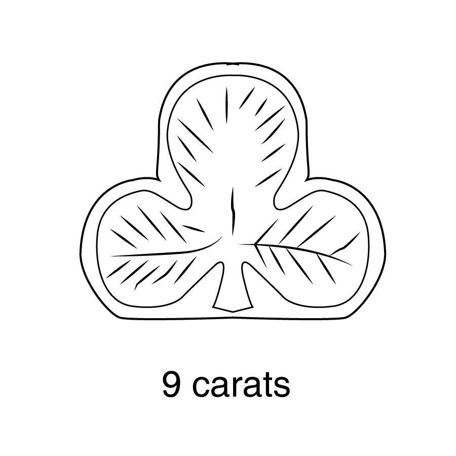 - Or 9 carats (375 millièmes) : trèfle, utilisé aussi bien sur les objets neufs que sur ceux de seconde main.